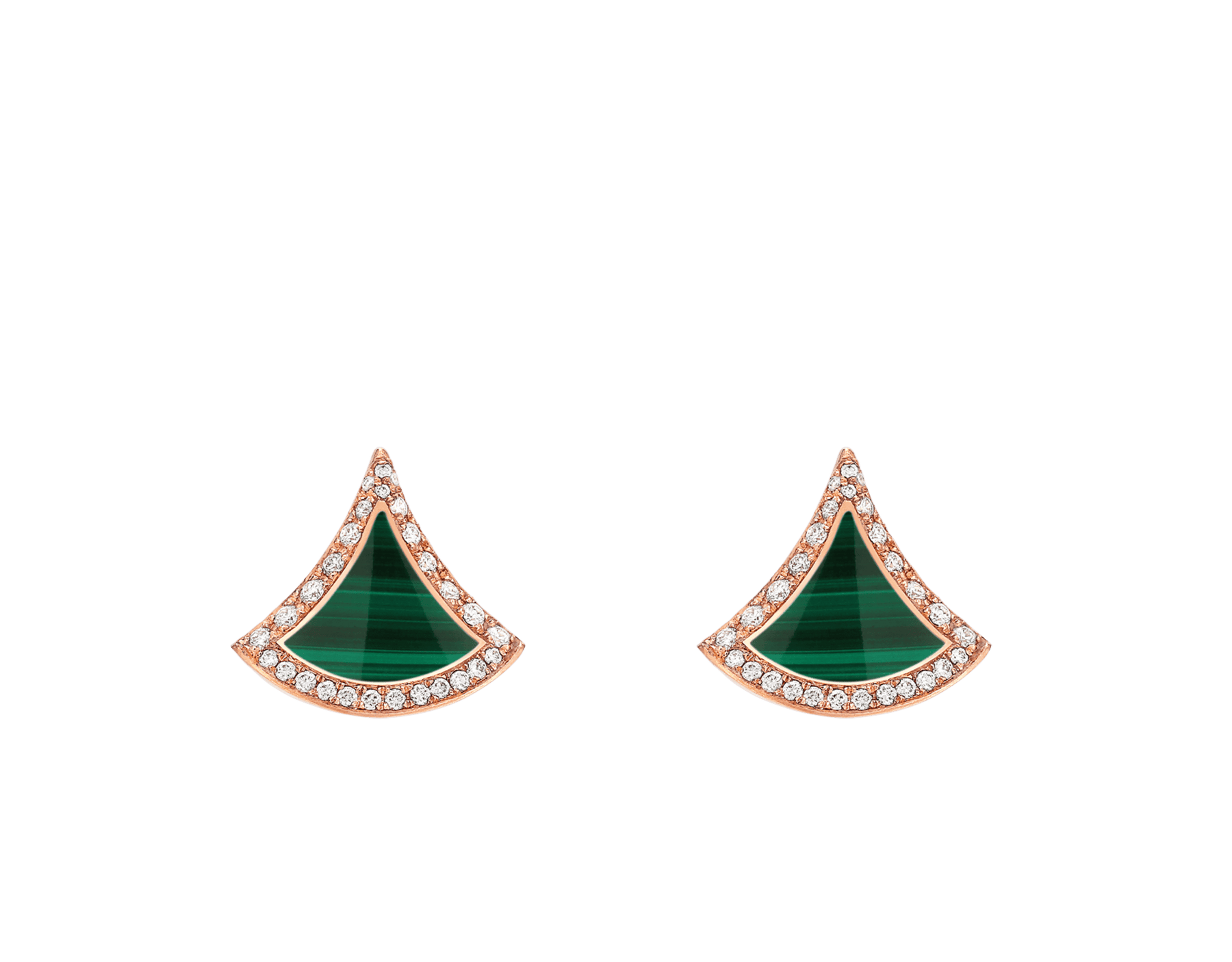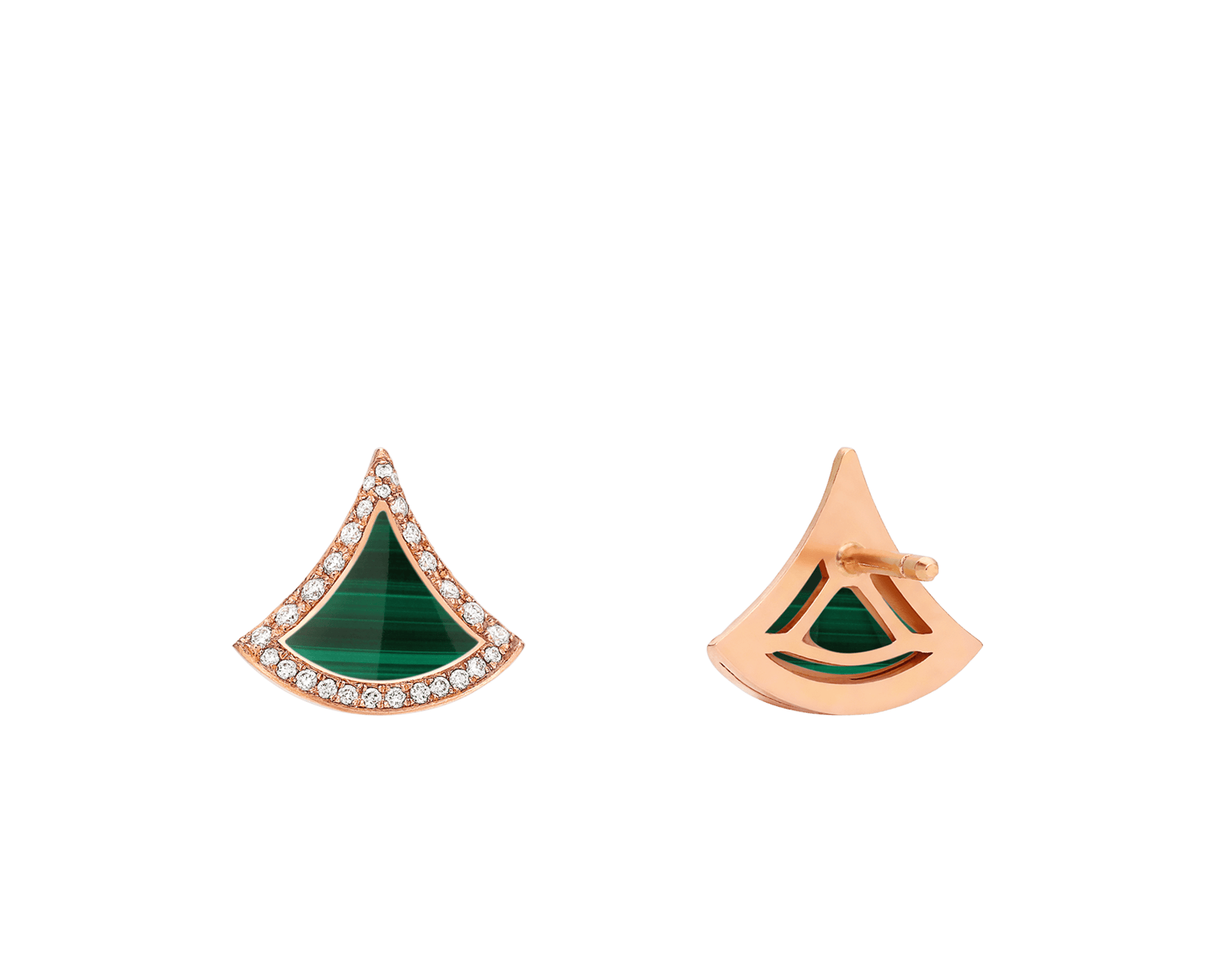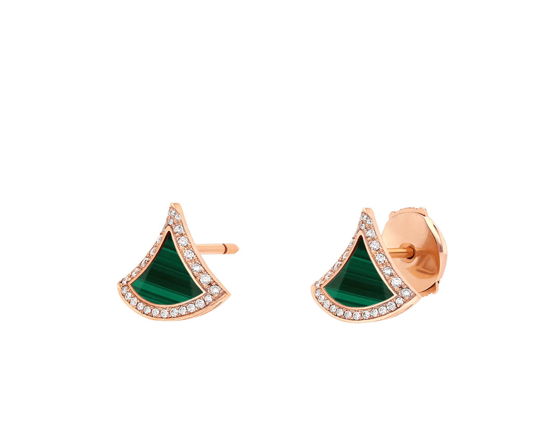Bob Mrs.Divas stud earrings in rose gold set with malachite inserts and pavé diamonds.