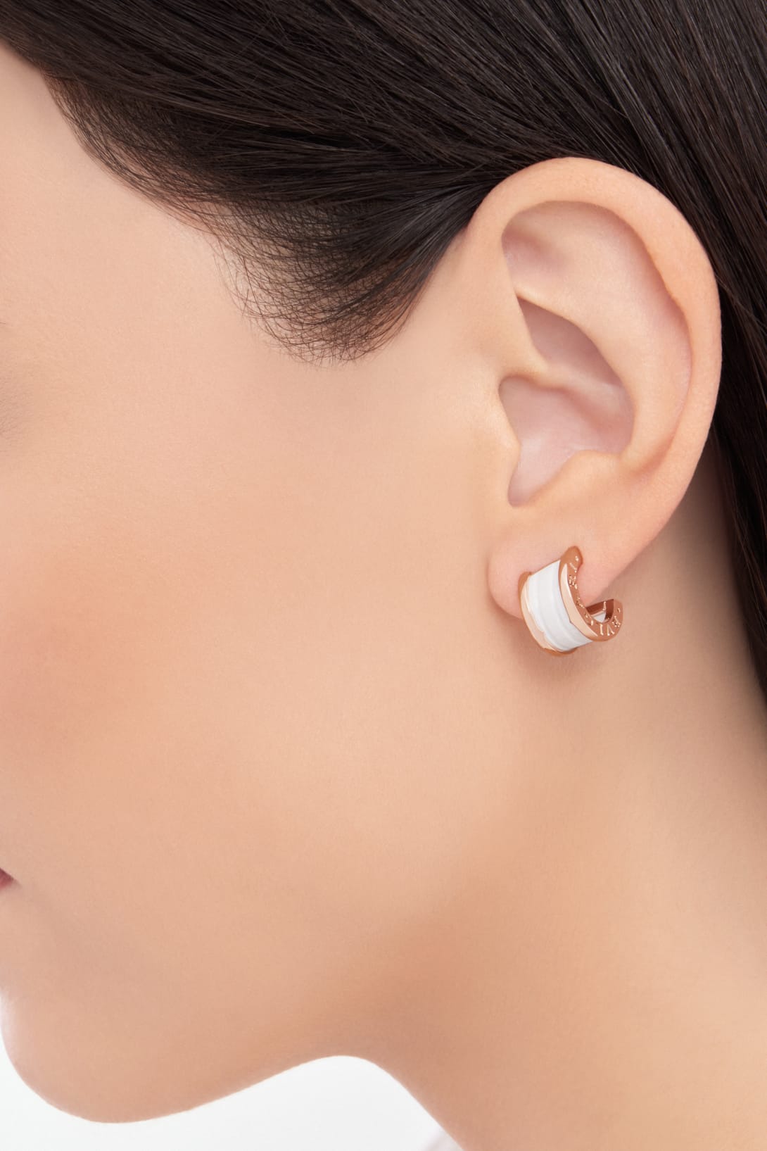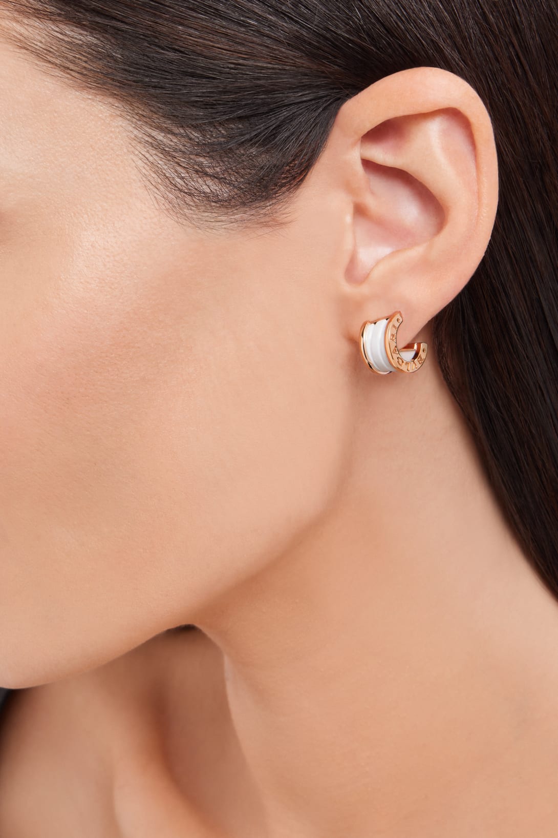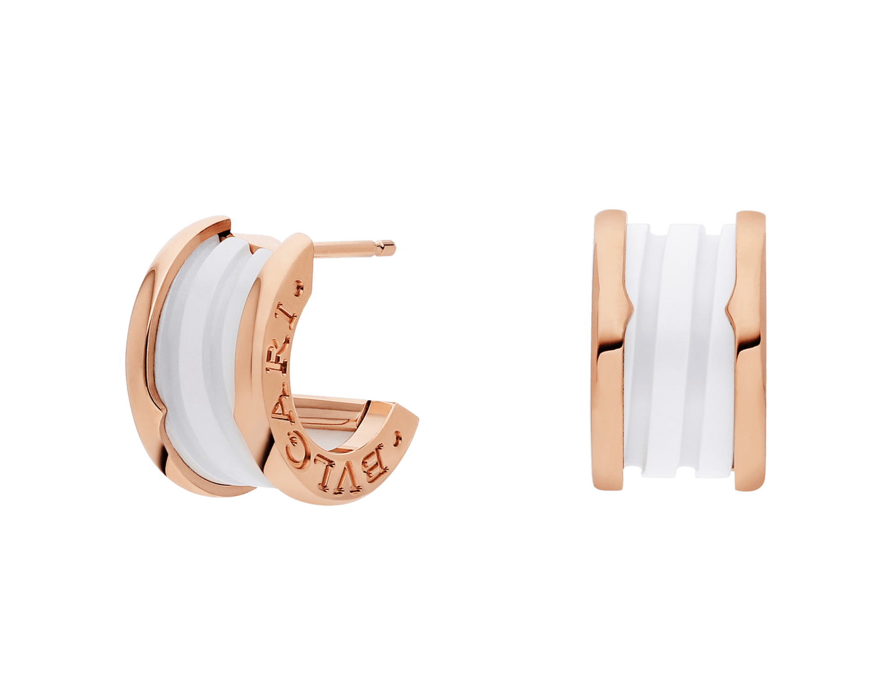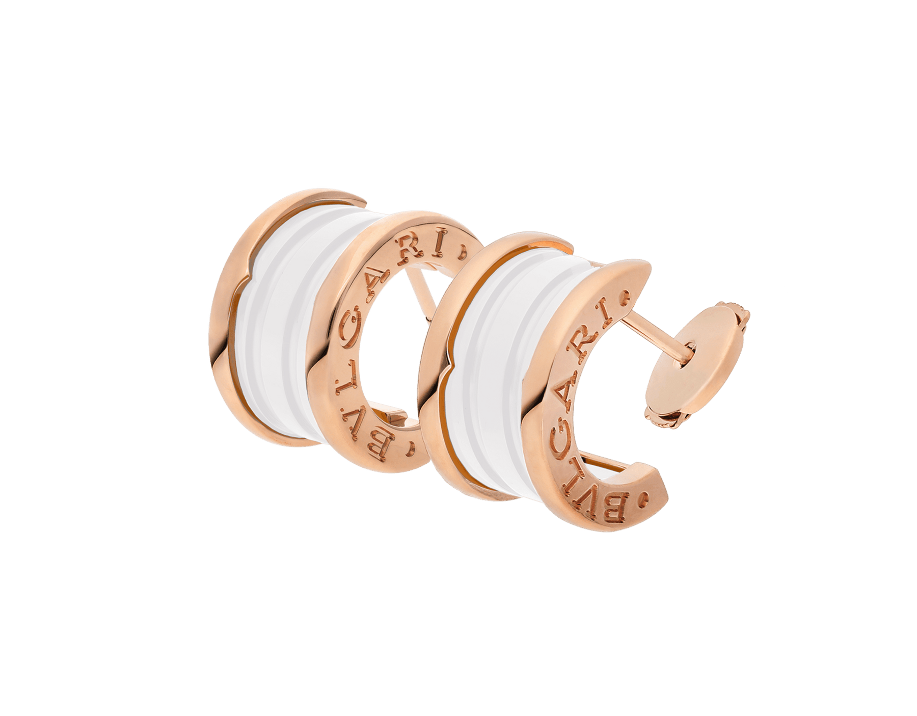 Inspired by the world-famous Colosseum, the Bob earrings are an authentic expression of Bob creative vision while challenging the very nature of jewelry design. The pure and unique spiral design symbolizes the harmonious existence of past, present and future, reflecting the extraordinary magnificence of the eternal city of Rome and the pioneering spirit of this series. Bob earrings in rose gold set with white ceramic. 316 stainless steel gilt.