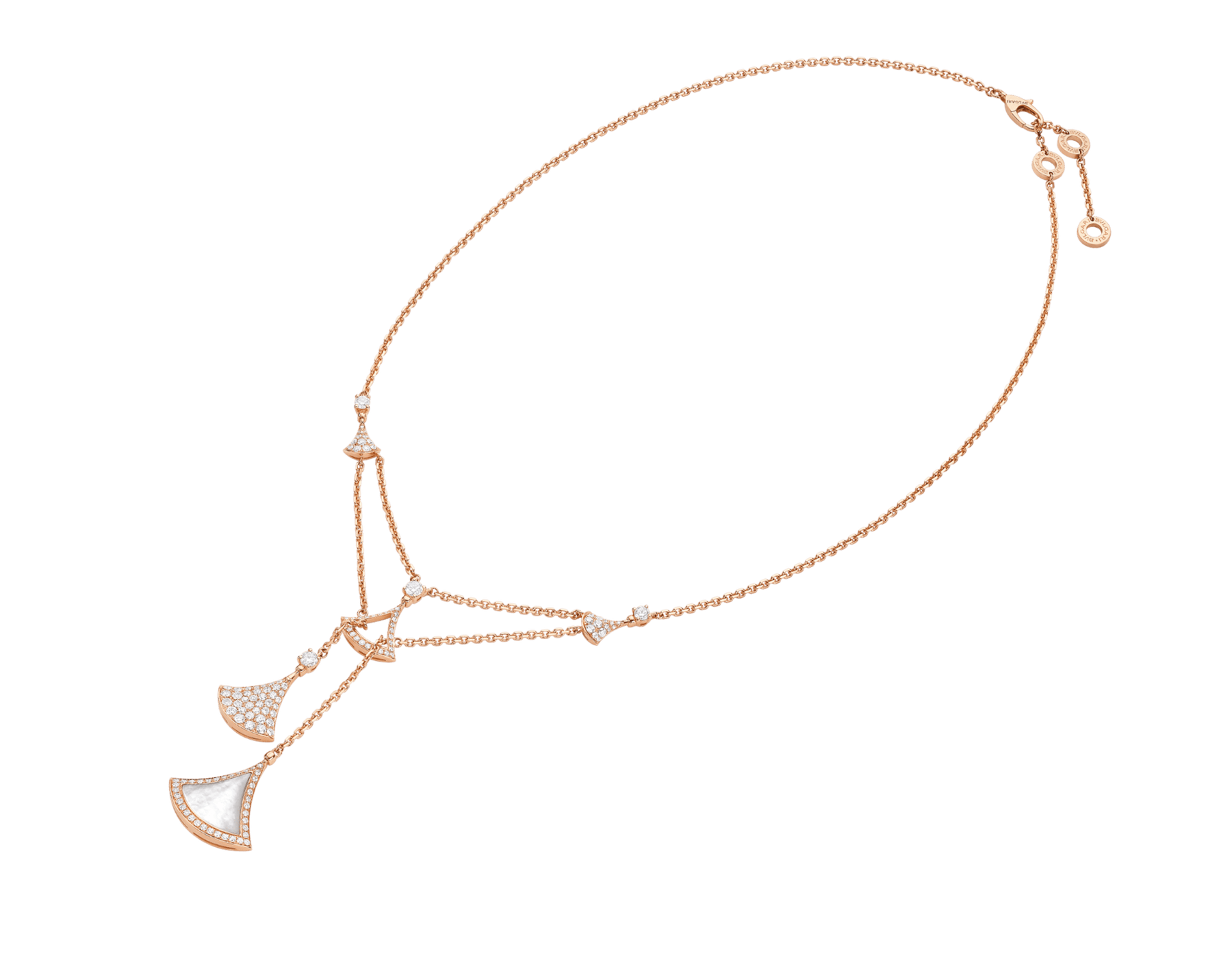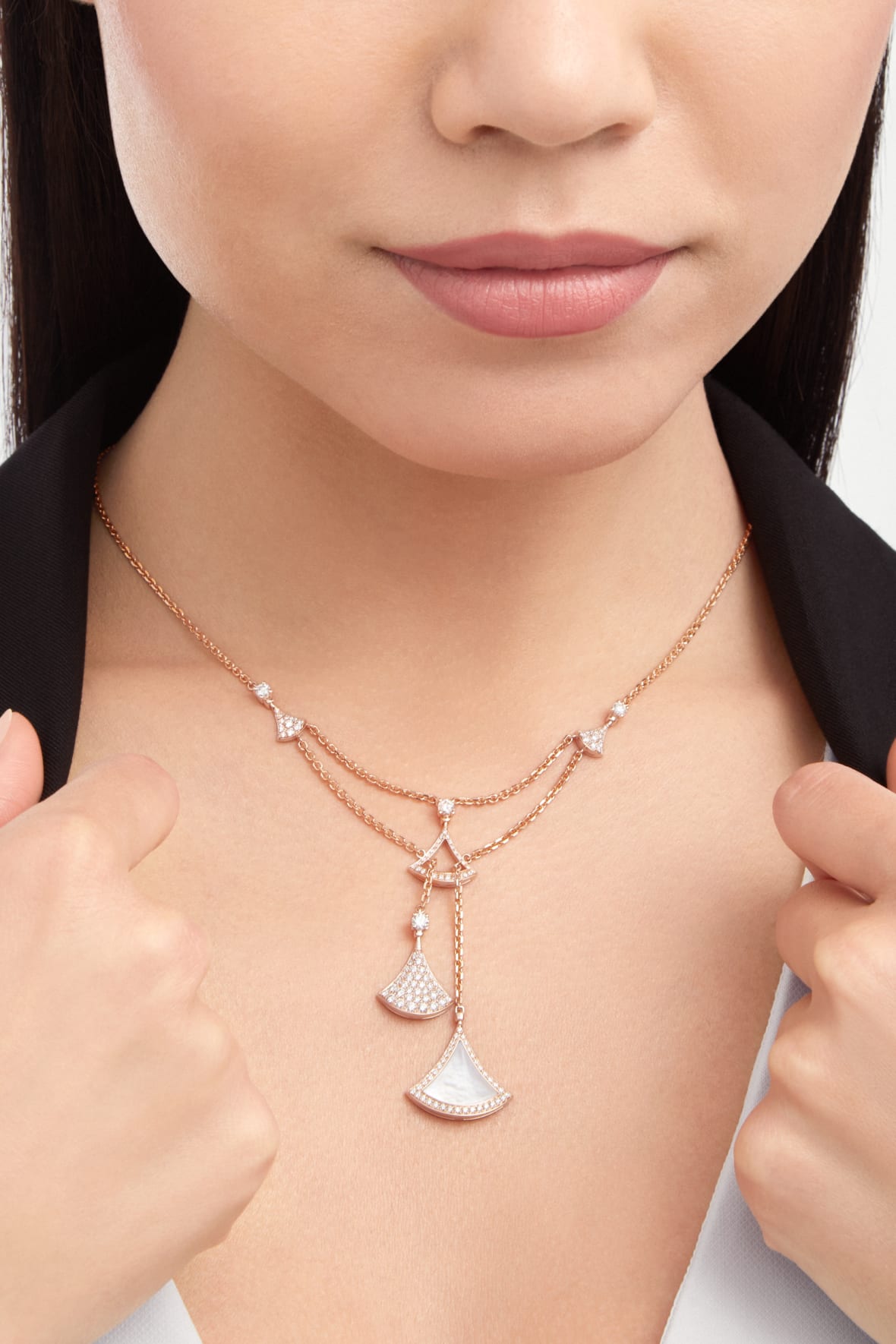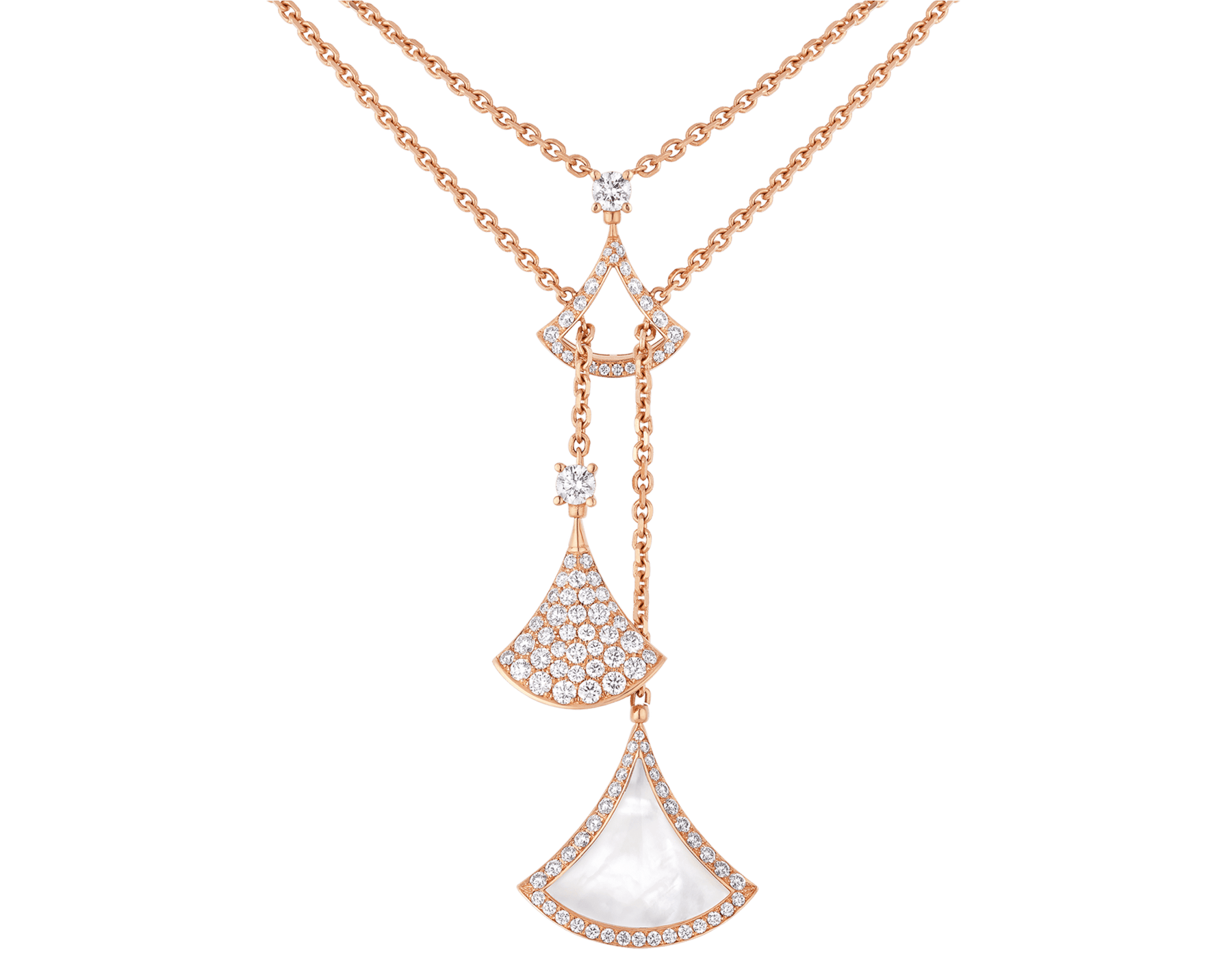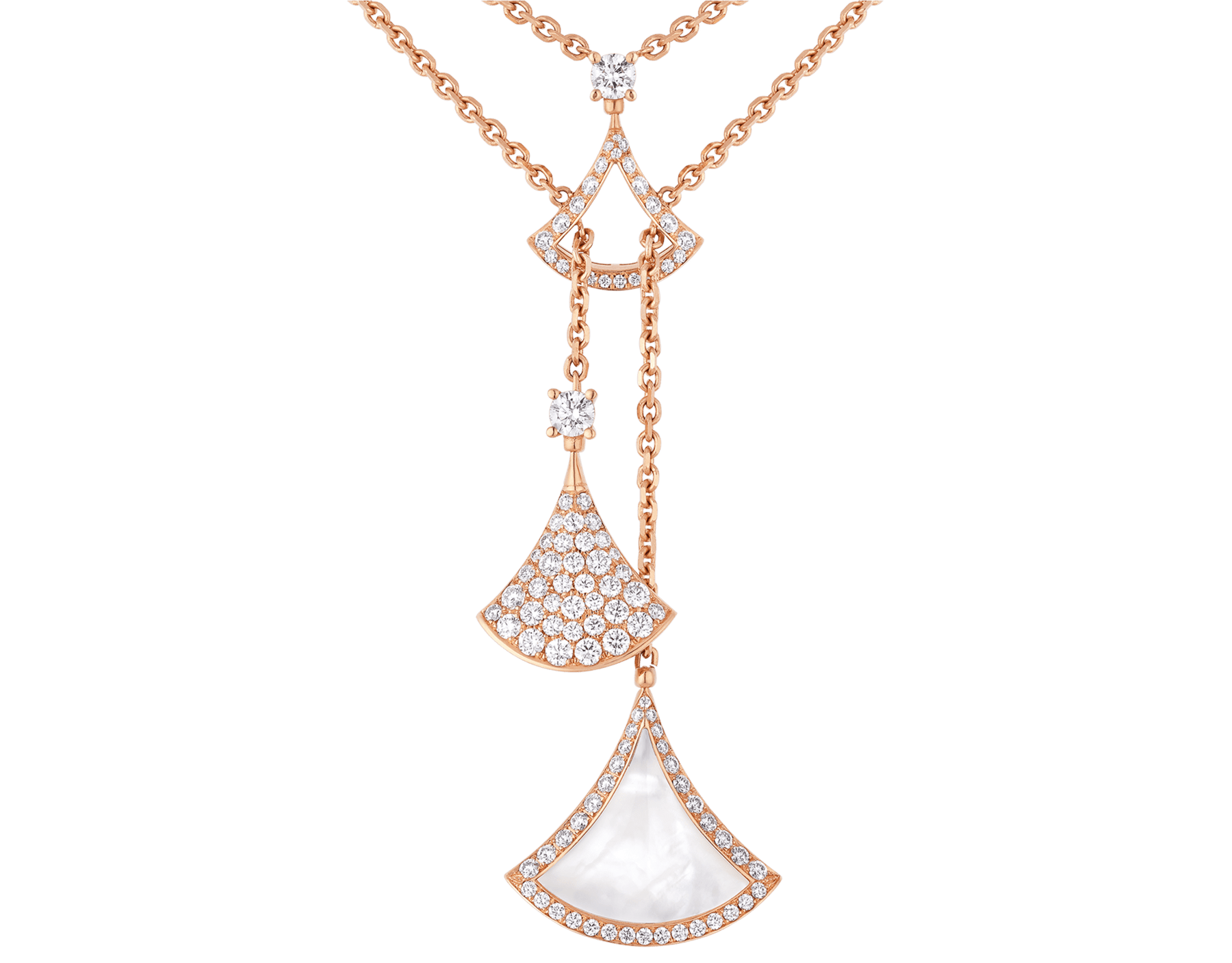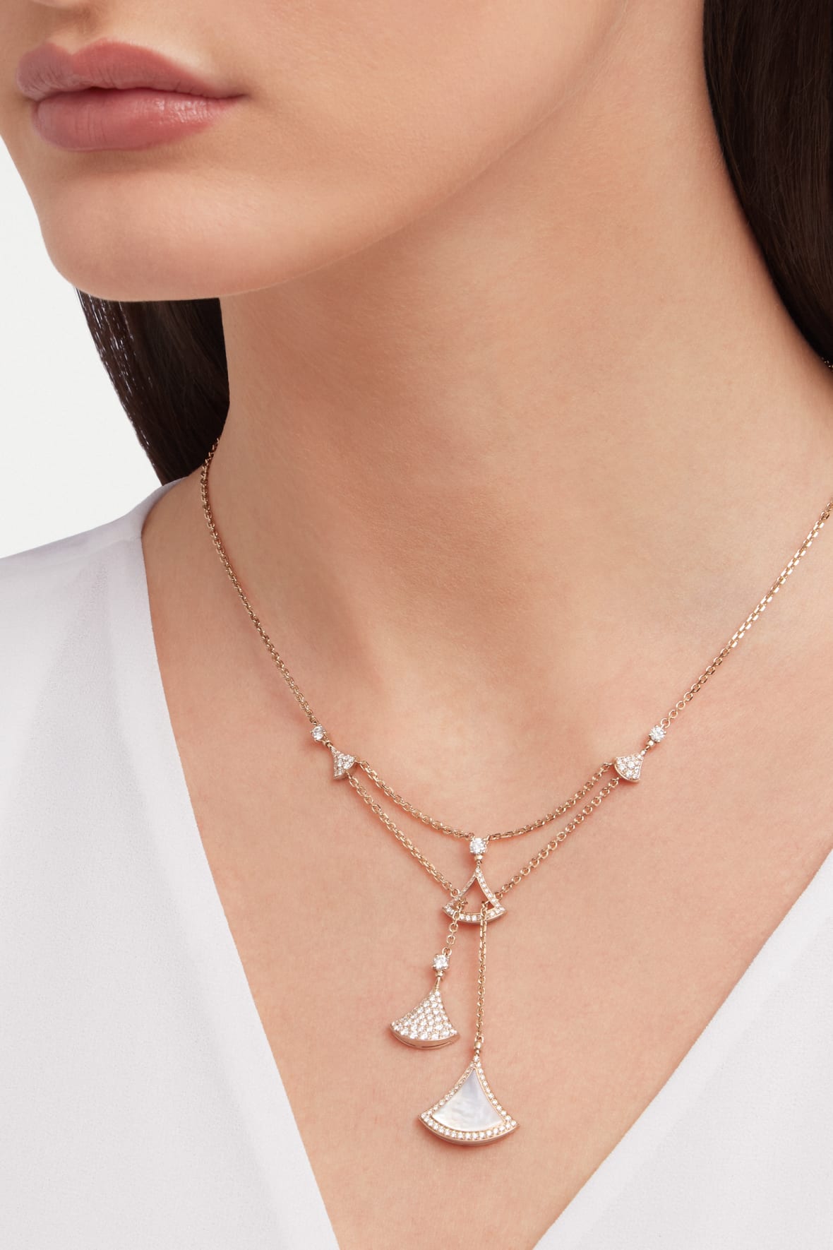Regular price Dhs. 296.00Bob Mrs. Divas necklace in rose gold with three fan-shaped motifs set with a mother-of-pearl insert and pavé diamonds
