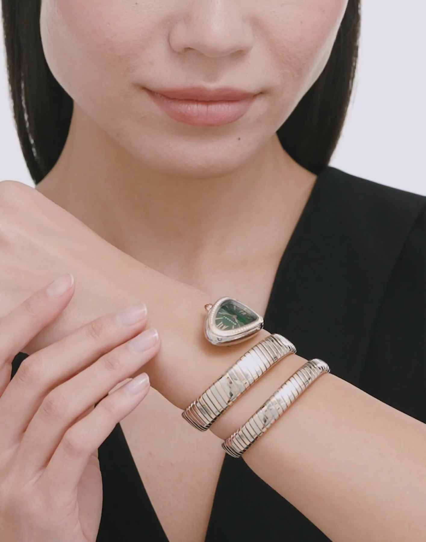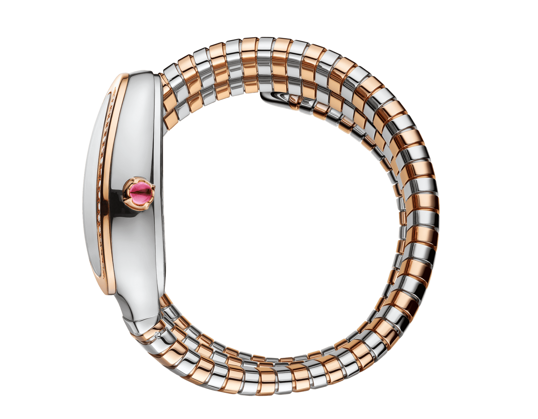 Gleaming with the refined sheen of its materials, the Serpenti Seduttori watch in 18 kt yellow gold and stainless steel makes time even more precious. Reimagining Bvlgari’s icon of seduction with a striking new design, the timepiece boasts the distinctive drop-shaped watch head and a white silver opaline dial. Inspired by the scales of a serpent, its sensual and flexible bracelet features a hexagonal pattern, conjuring the glamour of jewelry through captivating aesthetics.
