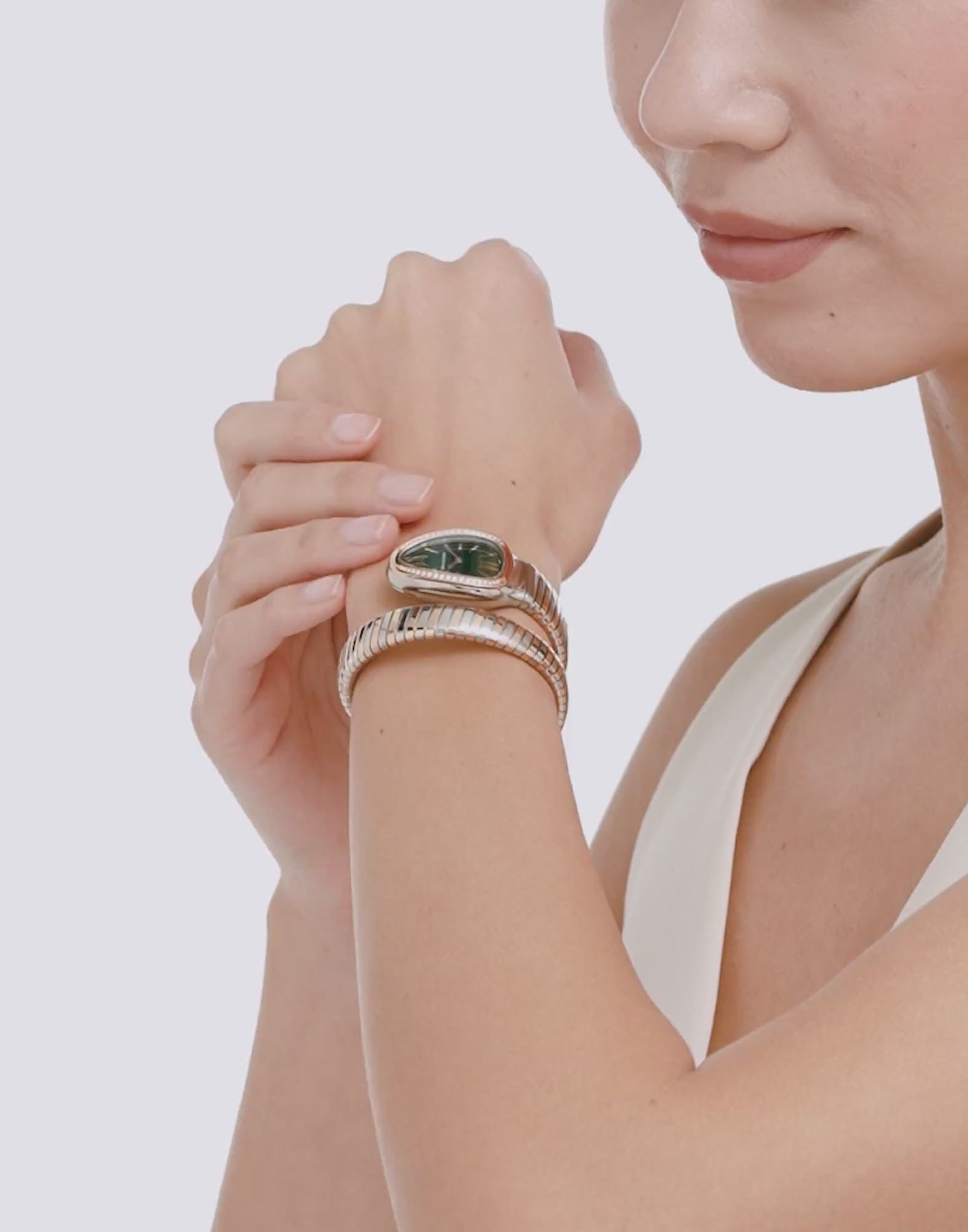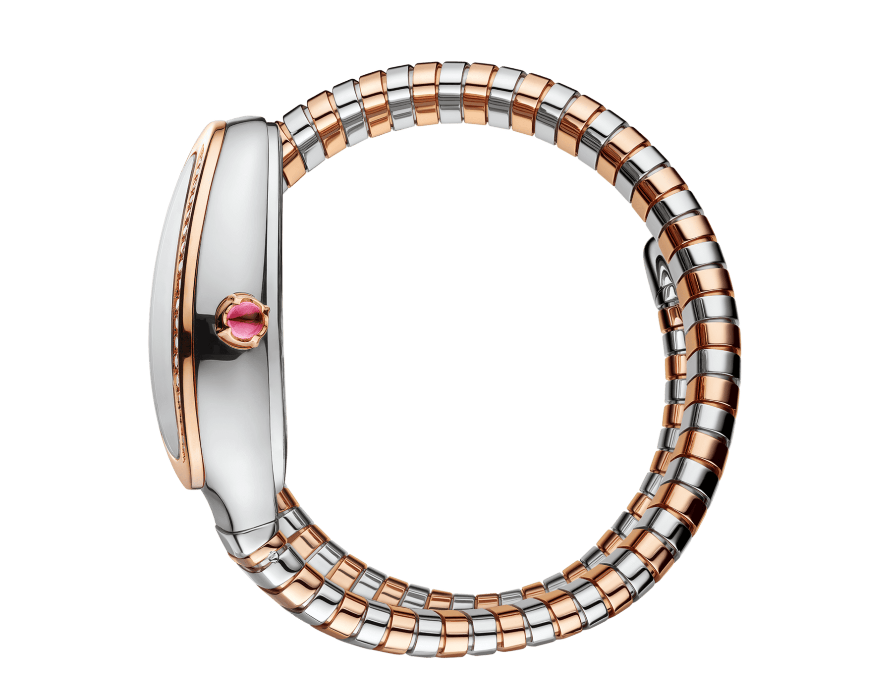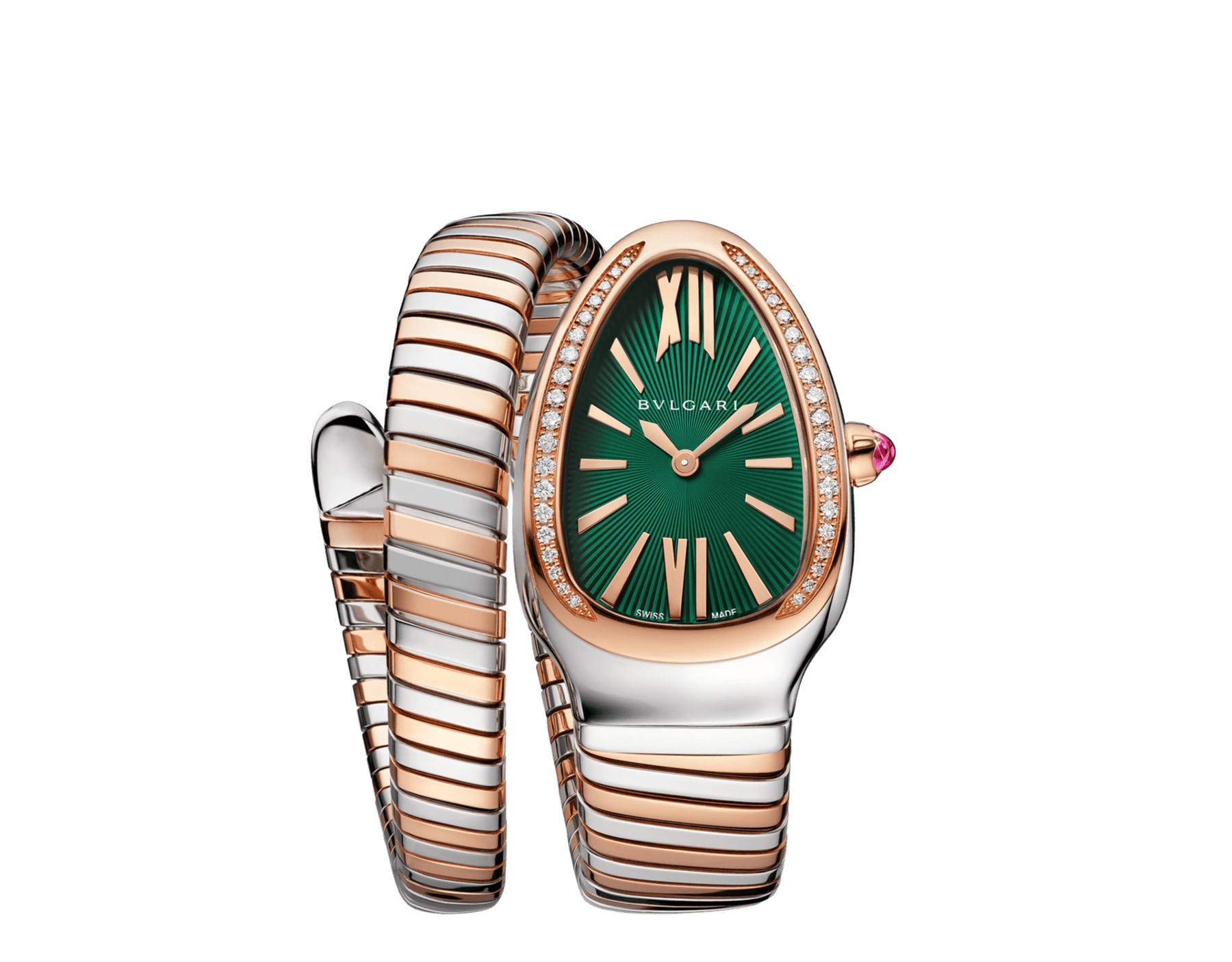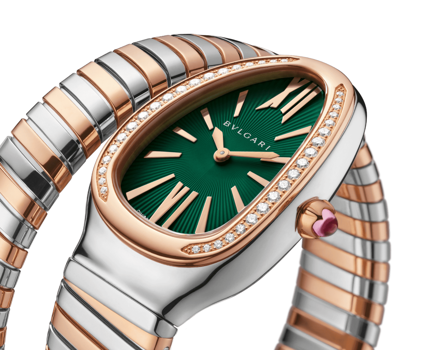 Regular price Dhs. 1,495.00watch with quartz movement, hours and minute functions, 35-mm stainless steel curved case, rose gold bezel set with round brilliant-cut diamonds, green lacquered dial with guilloché soleil treatment, rose gold crown set with a cabochon-cut rubellite and single-spiral bracelet in 18 kt rose gold and stainless steel. Water-resistant up to 30 meters.