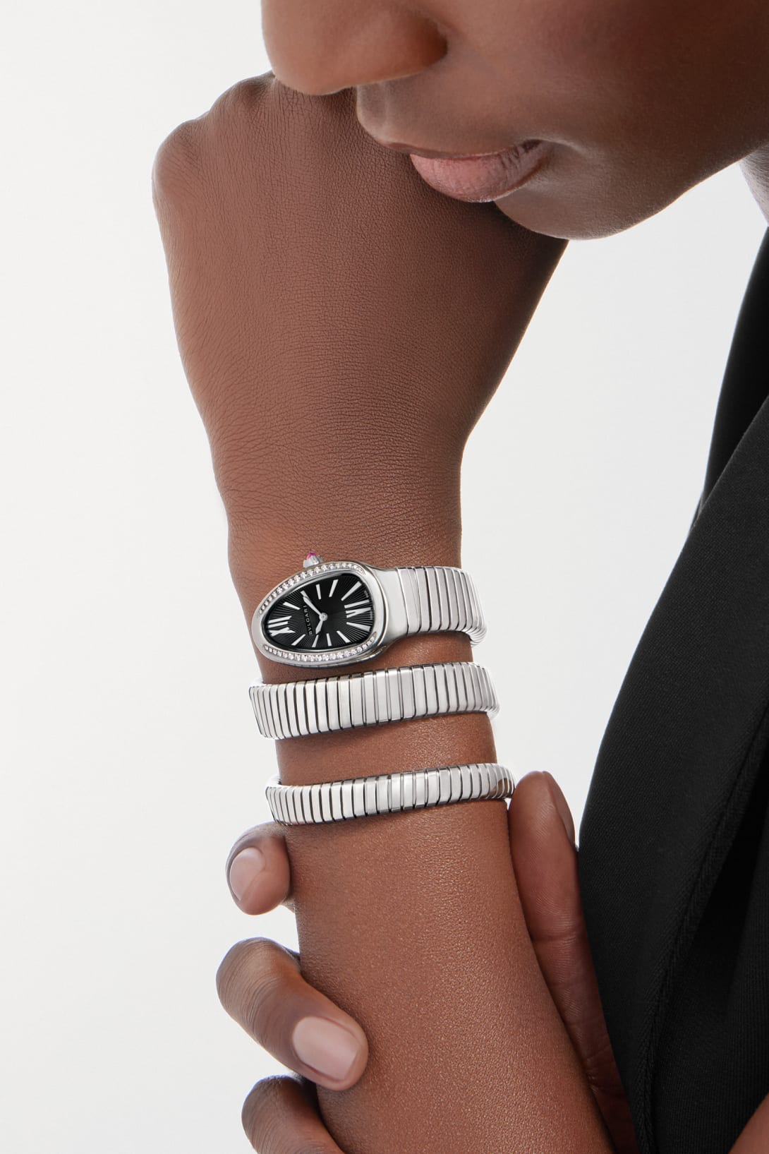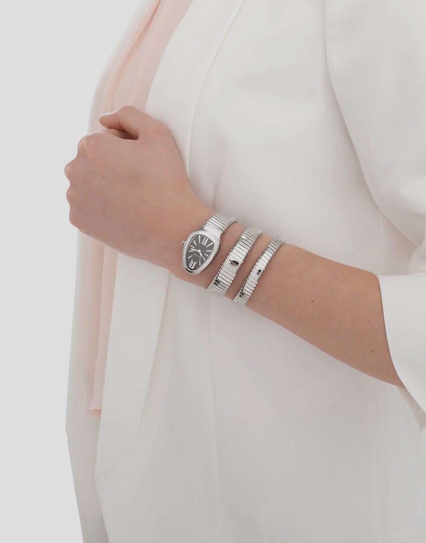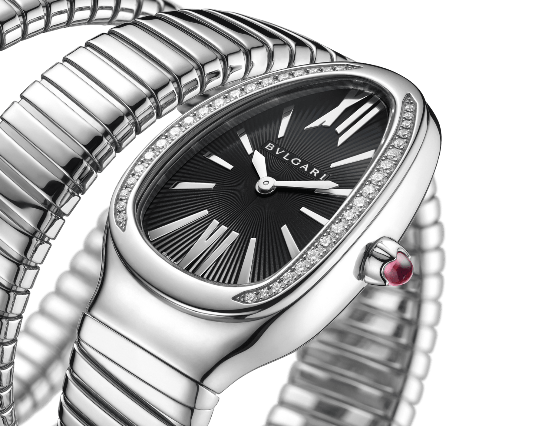 Regular price Dhs. 1,870.00Lady watch, 35 mm stainless steel curved case and bezel set with diamonds, stainless steel crown set with a cabochon cut rubellite, black dial with guilloché soleil treatment and double spiral stainless steel bracelet. Quartz movement hours and minutes functions. Water proof 30 m.