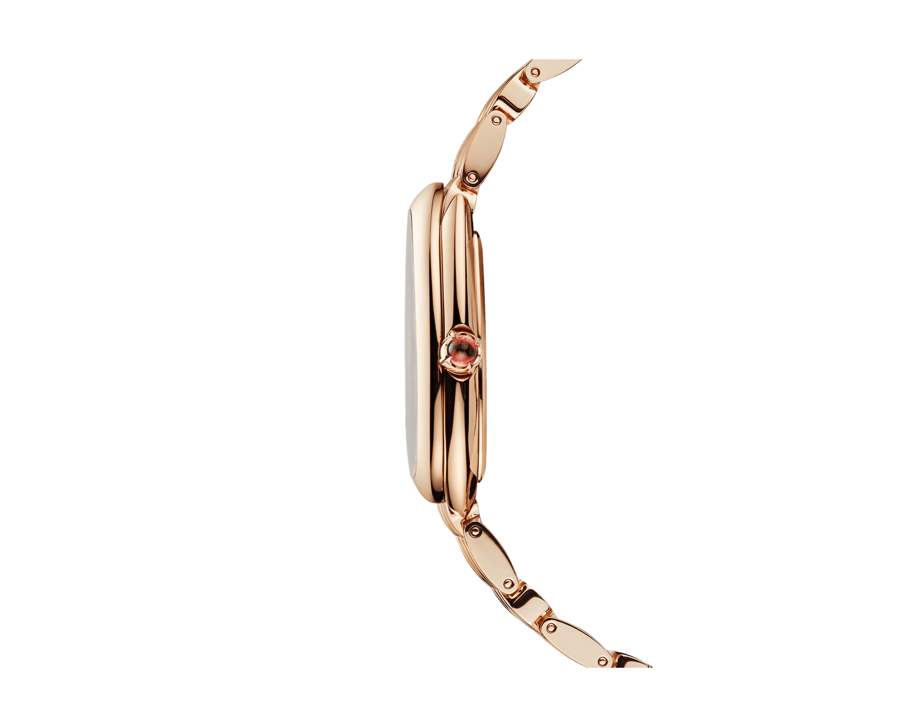 Regular price Dhs. 1,495.0033 mm rose gold case, rose gold crown set with a cabochon-cut pink rubellite, white silver opaline dial, rose gold bracelet and folding buckle.