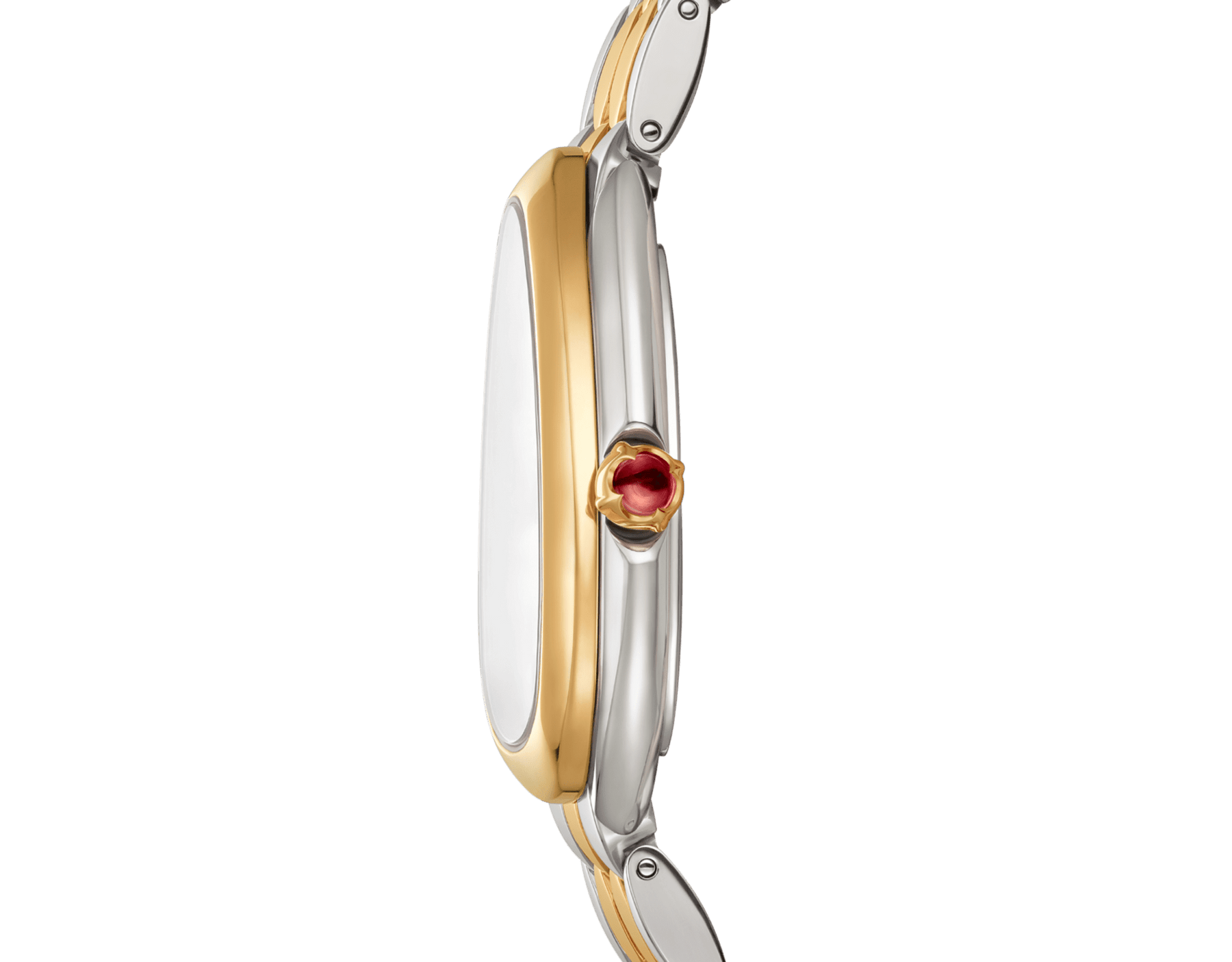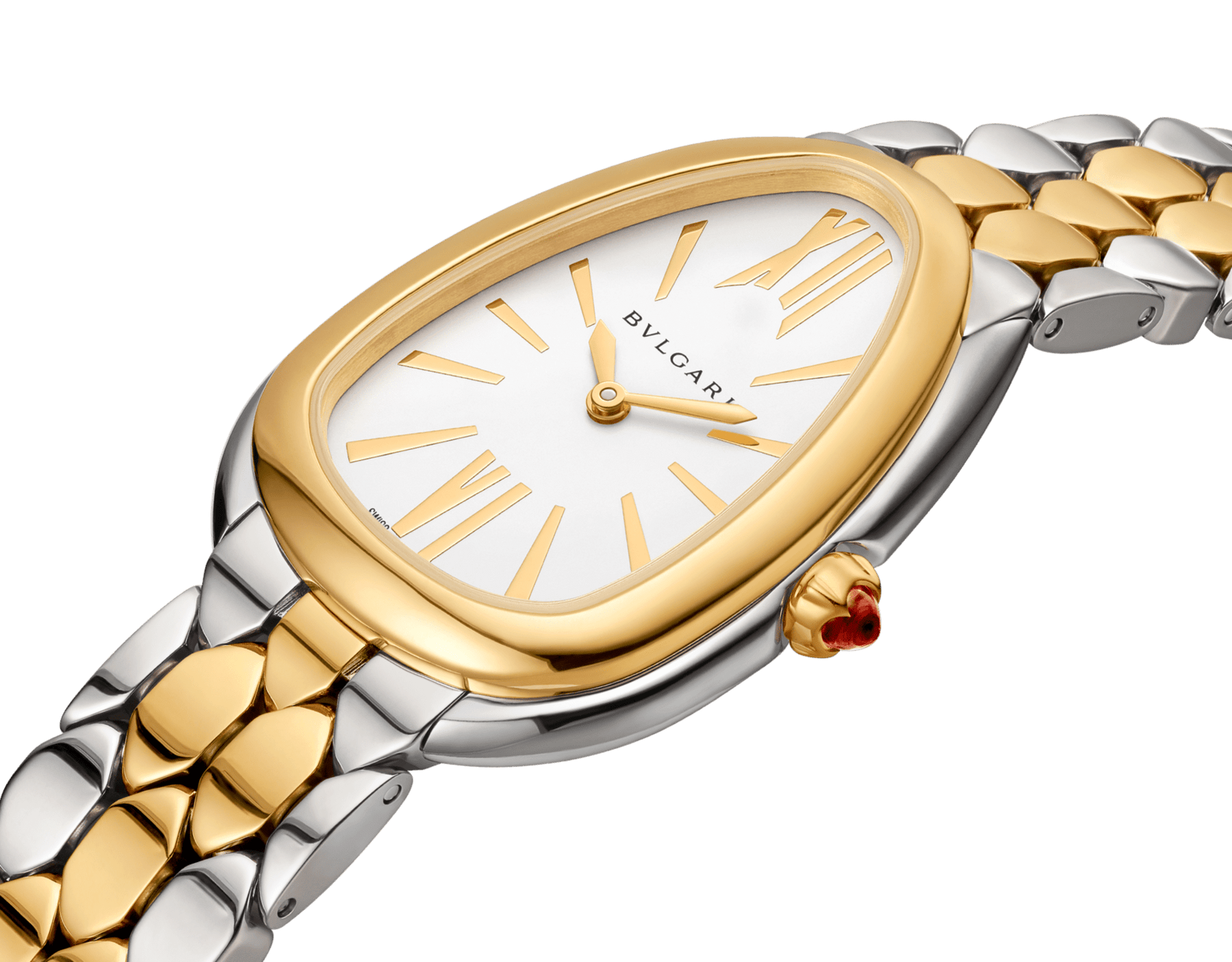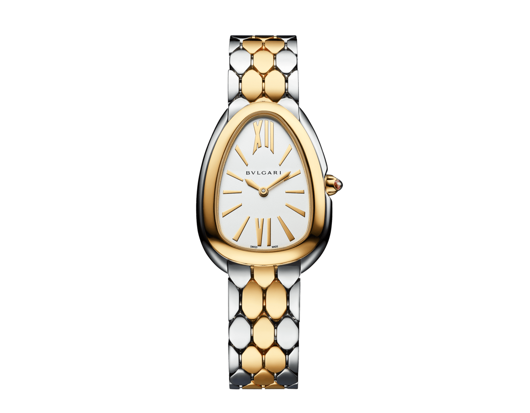 Regular price Dhs. 1,121.00Serpenti Seduttori watch with quartz movement, 33 mm stainless steel case, 18 kt yellow gold bezel, 18 kt yellow gold crown set with a cabochon-cut pink rubellite, white silver opaline dial, stainless steel and 18 kt yellow gold bracelet with folding buckle. Water-resistant up to 30 meters.
