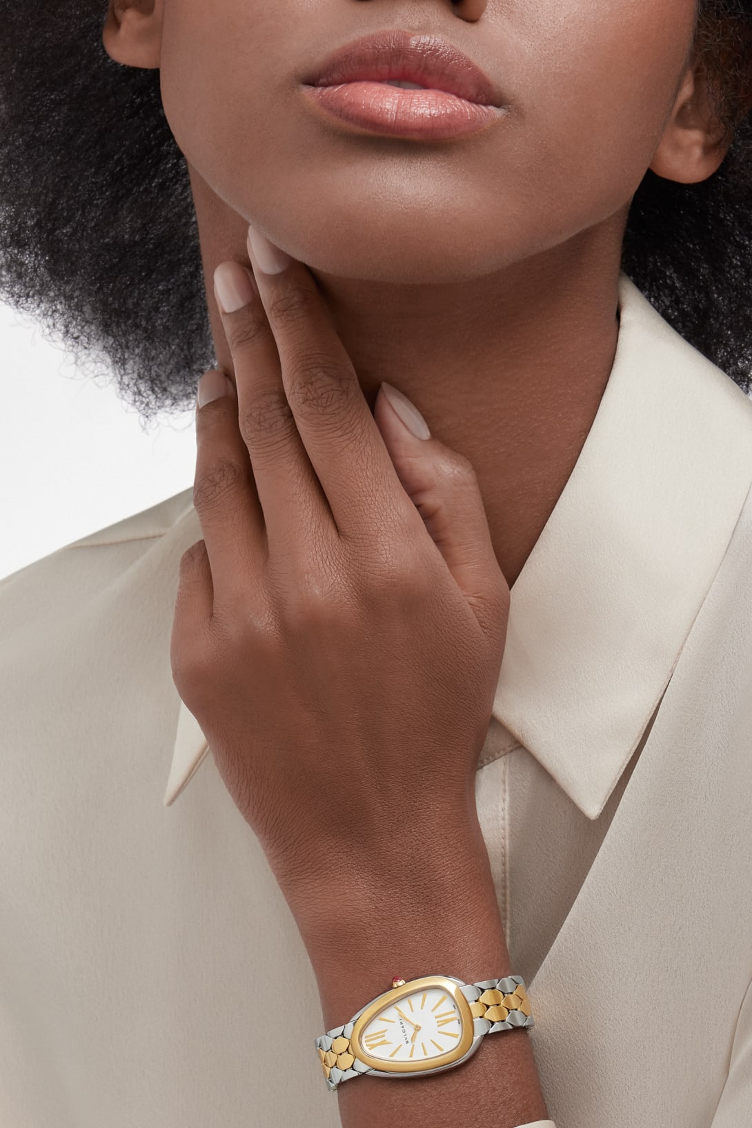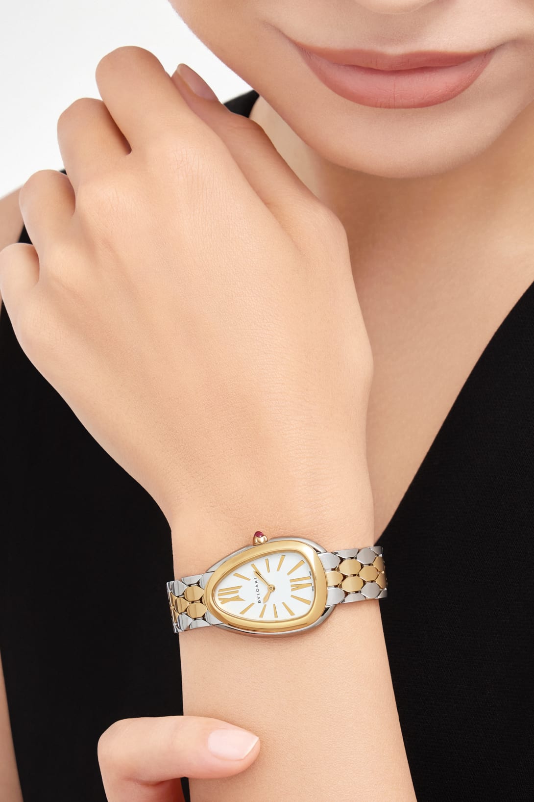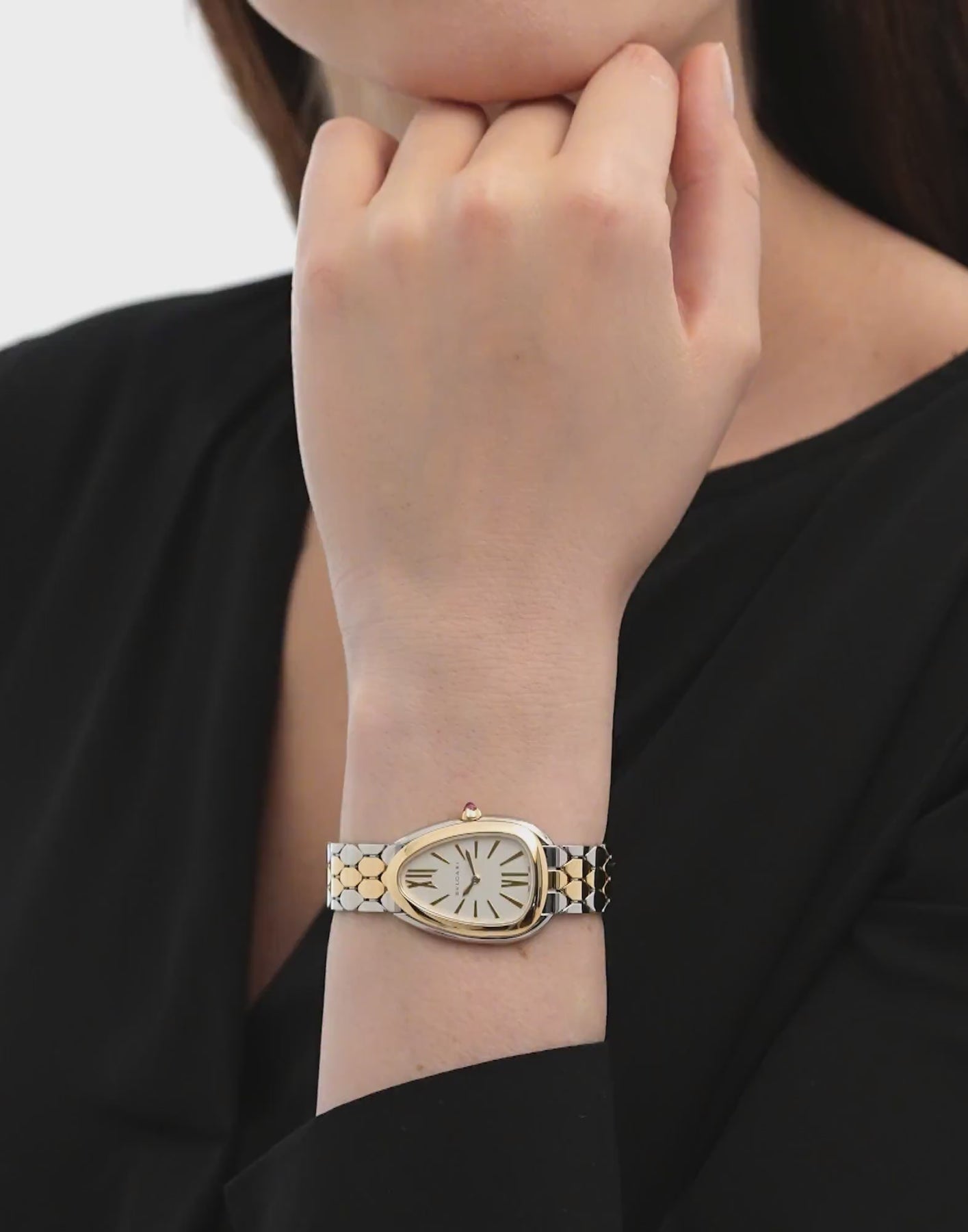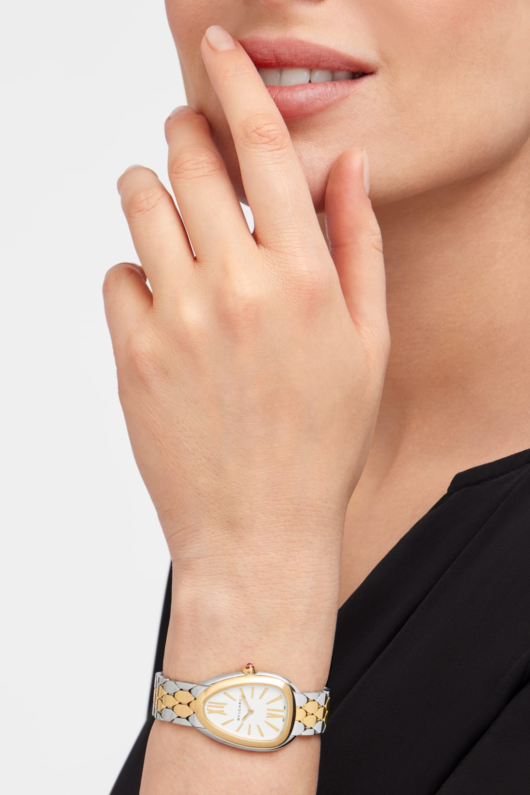 Regular price Dhs. 1,121.00Serpenti Seduttori watch with quartz movement, 33 mm stainless steel case, 18 kt yellow gold bezel, 18 kt yellow gold crown set with a cabochon-cut pink rubellite, white silver opaline dial, stainless steel and 18 kt yellow gold bracelet with folding buckle. Water-resistant up to 30 meters.