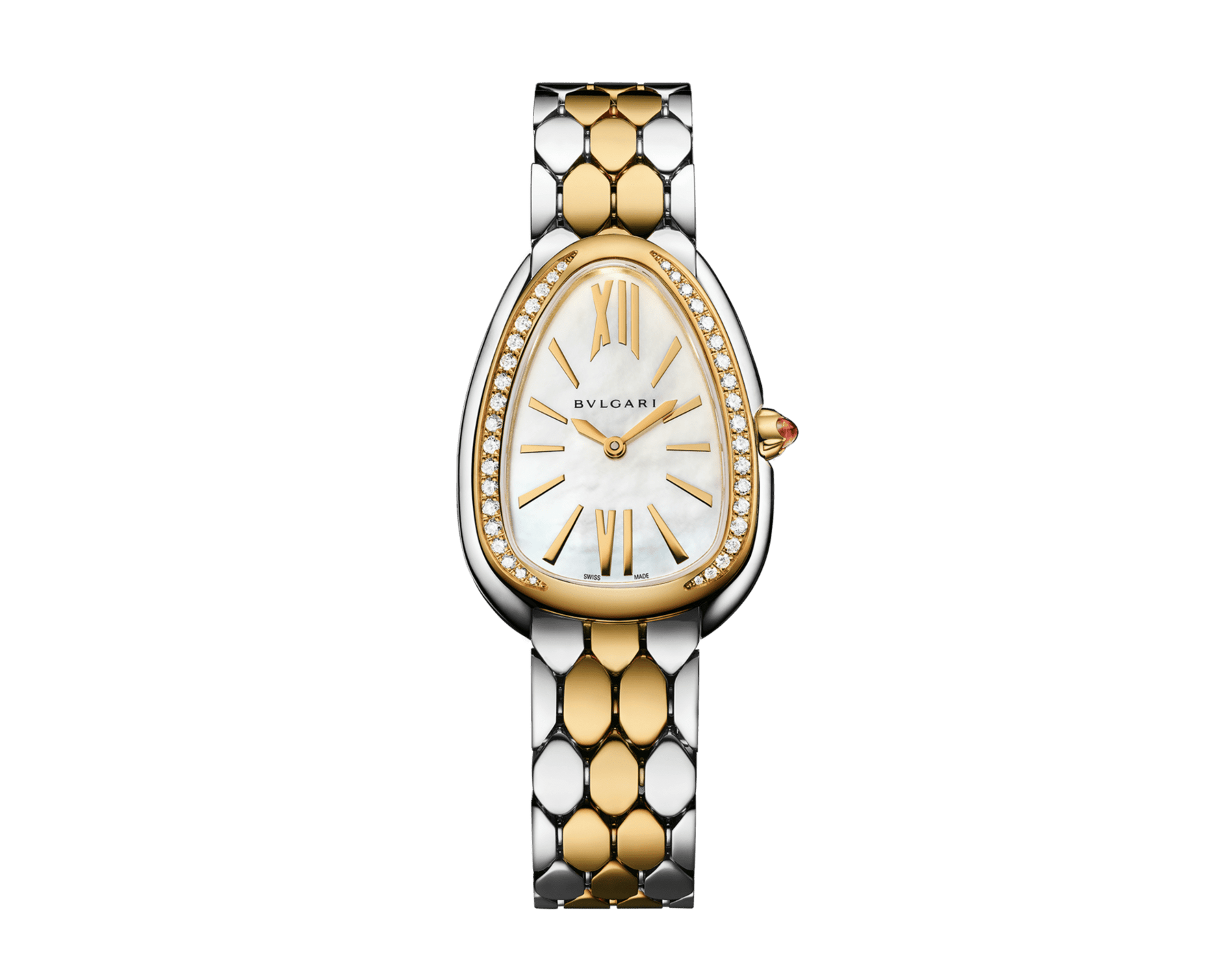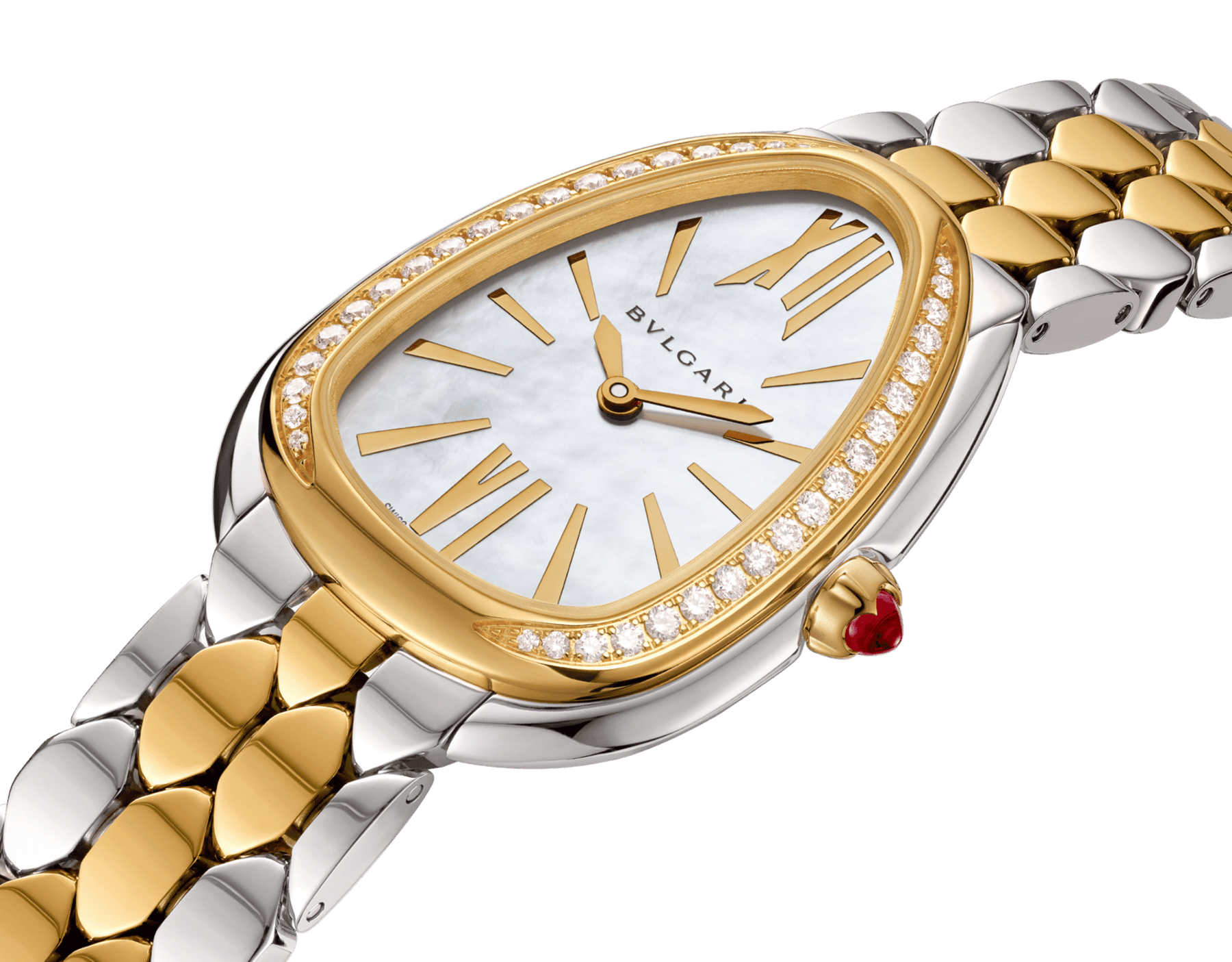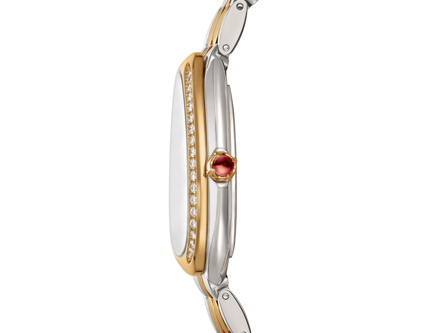 Regular price Dhs. 1,495.00hours and minutes functions, 33 mm stainless steel case, yellow gold bezel set with brilliant-cut diamonds, yellow gold crown set with a cabochon-cut pink rubellite, mother-of-pearl dial, stainless steel and yellow gold bracelet with folding buckle. Water-resistant up to 30 metres.