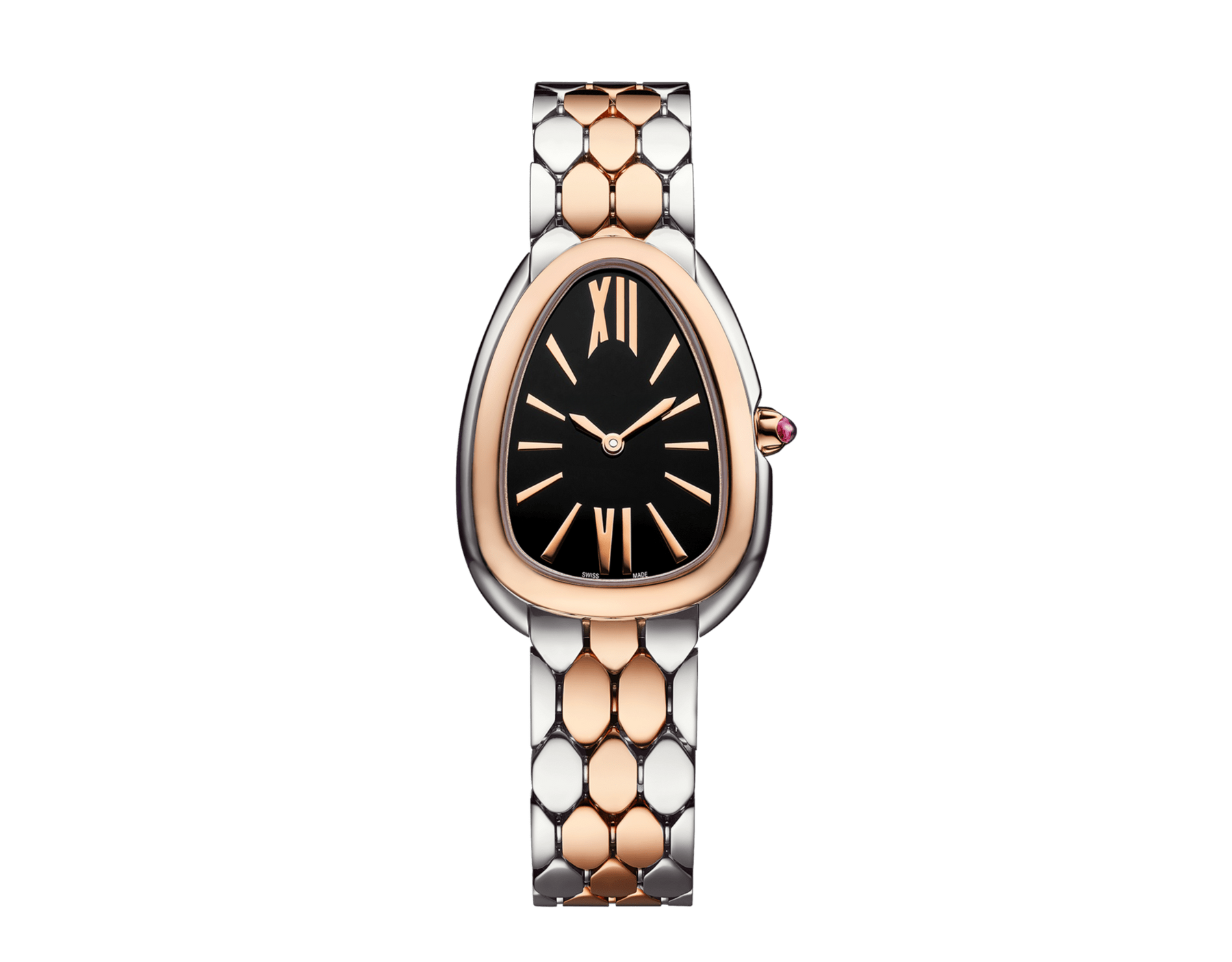 At its heart lies a deep, black lacquered dial, providing a dramatic backdrop for the luminous rose gold Roman numerals and hands. The signature drop-shaped case seamlessly flows into the Spiga-patterned bracelet—a sophisticated, flexible design inspired by the rhythmic beauty of a serpent’s scales. Elegant yet bold, this watch is designed for the woman who commands attention with effortless grace.